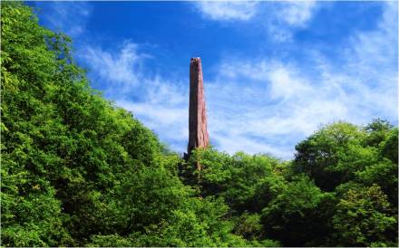 天碑高達(dá)50余米,是一個巨型崩塌巖塊。由于崩塌時的位移,原來近水平產(chǎn)出的巖層此時呈直立狀,巍然聳峙在峽谷一側(cè),高大雄偉、氣勢恢弘,一景多變,步移景換,從不同角度仰望,或蒼鷹、或飛鳥、或飛魚、或刀背、或天碑,大自然賦予其無限美感。傳說,這本是二郎神斬殺小白龍的大刀,圣母媧皇在安置了小白龍神位之后,又把二郎神丟下的大刀豎立起來,刀背對著無頭冤神洞,于是二郎神斬殺小白龍的大刀,成了紀(jì)念小白龍的無字碑,人們稱其為“擎天刀碑石”。