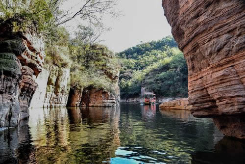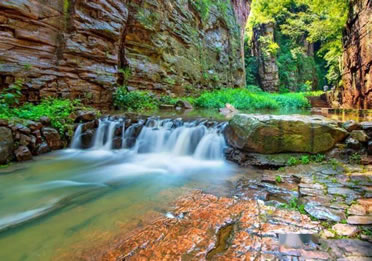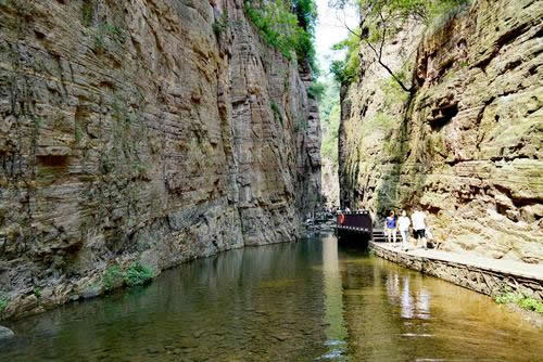 龍?zhí)洞髰{谷景區(qū)是王屋山——黛眉山世界地質(zhì)公園的核心景區(qū),是一條以典型的紅巖嶂谷群地質(zhì)地貌景觀為主的峽谷景區(qū)。谷內(nèi)關(guān)峽相望,潭瀑聯(lián)珠,壁立萬仞,峽秀谷幽,經(jīng)過十二億年的地質(zhì)沉積和260萬年的水流切割旋蝕所形成的高峽甕谷、山崩地裂奇觀,堪稱世界一絕,人間少有,享有“中國嶂谷第一峽”、“古海洋天然博物館”、“峽谷絕品”和“黃河水畫廊”等美名。
