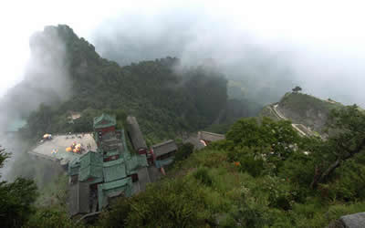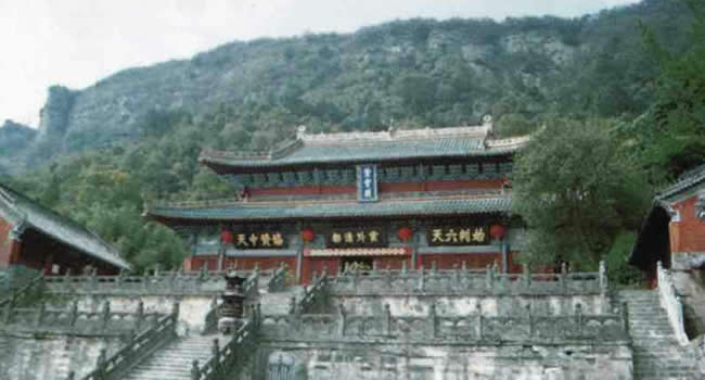 紫霄宮:建于明永樂(lè)十一年(公元1413年),原建宮殿、廊廡、齋堂、亭臺(tái)等860多間,賜額“太元紫霄 宮”。紫霄宮背依展旗峰;面對(duì)照壁、三臺(tái)、五老、蠟燭、落帽、香爐諸峰;右為雷神洞;左為禹跡池、寶珠峰。周圍山巒天然形成一把二龍戲珠的寶椅,明永樂(lè)皇帝封之為“紫霄福地”。