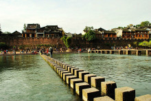 沱江跳巖古城人氣旺盛的風(fēng)景之一。這是一座古道橋梁,最早建于唐代,是乾州進(jìn)入當(dāng)時(shí)的五寨司城的必經(jīng)之路。清康熙四十三年(1704年)重修,仍是鳳凰至乾城的古道。跳巖最初由四十多個(gè)紅色長(zhǎng)方體巖墩子組成,每墩相距二尺,便于鄉(xiāng)民肩挑背馱入城,但每年漲洪水時(shí)總有跳巖石墩被沖倒或沖走。民國(guó)時(shí)期,縣長(zhǎng)李宗祺讓在跳巖上架以木板,這比以前行走更為方便,但仍連墩帶跳板被沖走。1950年,鳳凰縣人民政府成立,又重新補(bǔ)缺換新將石墩加大,將兩個(gè)墩子聯(lián)成一個(gè),跳巖全長(zhǎng)100米,共15個(gè)巖墩,上鋪厚實(shí)的木板,并以鐵鏈在河底從巖上打眼,用鐵絲系緊,跳巖堅(jiān)固牢實(shí),保存完好,如今不僅仍是兩岸人民來(lái)往的要道,而且成為鳳凰古城頗具民族特色的亮麗風(fēng)景。2000年秋,為了進(jìn)一步改善群眾過(guò)河的條件,也為了更好地美化裝點(diǎn)古城,鳳凰縣撥款在老跳巖幾十米距離的河下游,新修了一道雙墩跳巖,兩排跳巖相隔一尺左右,一高一低,并排而立,橫跨江上,每排跳巖66墩,一字列于江面,每個(gè)石墩之間的距離也就一小步左右,來(lái)的走一排,去的走另一排。