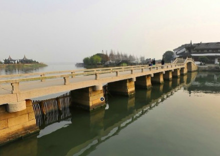 該橋又稱南塘橋、南觀音橋。建于南宋,坐落在古蓮池西側(cè)的三圖河上,為明代“錦溪八景”之一,“古井風亭”所在地,