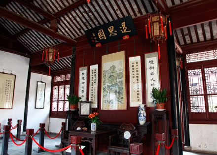 主建筑仿明代結(jié)構(gòu),俗稱“紗帽廳”。因梁頭棹木像明代官帽的帽翅,故名。該庭院高大寬敞,肅穆莊重。五架梁兩側(cè)中心刻有“八駿圖”,梁兩端刻有“鳳穿牡丹”。梁底則刻有“稱心如意”、“必定高中”等圖案!凹喢背帷保戳侯^棹木)上刻有《三國(guó)演義》中的“古城會(huì)、三英戰(zhàn)呂布”等八幅戲文透雕,形象逼真,呼之欲出。這組透雕被《中國(guó)戲曲志·蘇州分卷》收錄。