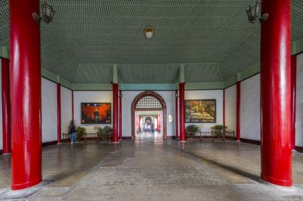 總統(tǒng)府建筑群的主軸線,由門樓、大堂、二堂、八字廳、會客廳、麒麟門、政務局樓、子超樓組成。建筑風格前半部分以中式為主,后半部分則以西式居多。