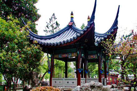 方勝亭,俗稱"鴛鴦亭",是民國前江南惟一的方勝亭。方勝,又稱雙菱,指兩菱形相疊。亭基方勝,上為雙頂、遠觀似雙亭并立,近看卻一亭獨佇,小巧玲瓏,頗為別致。飛檐翹角,如欲飛的鴛鴦。梁柱間有很大的彩繪"雀替木",這是清代建筑的特征之一。因其少用斗拱,為出挑檐,只得加大這種斜角支撐物。亭里可見一些龍鳳獅虎等動物形狀的刻繪。