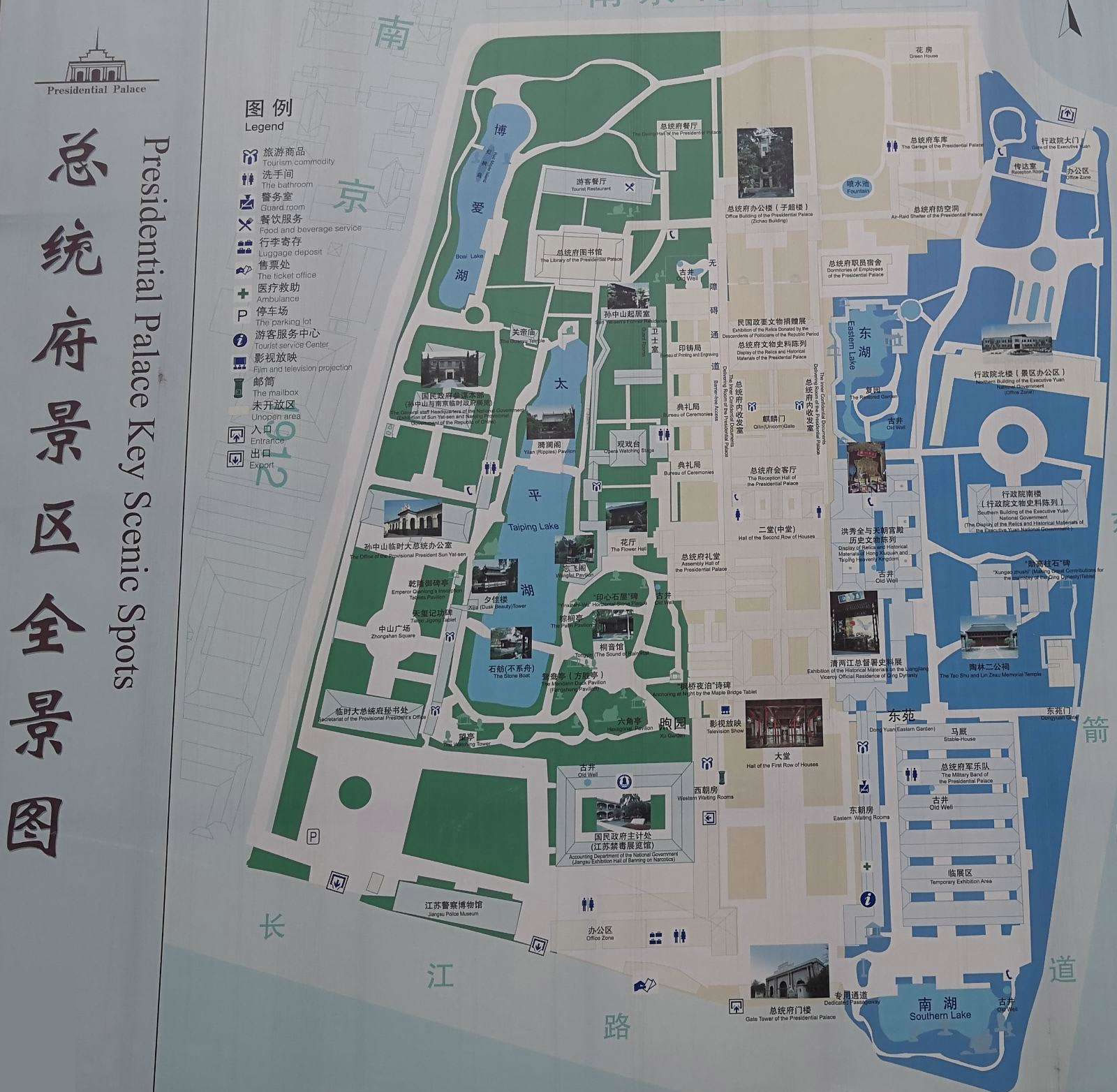 總統(tǒng)府(中國近代史博物館)占地面積9萬平方米,共分三個參觀區(qū)域。中區(qū)(中軸線)主要是國民政府、總統(tǒng)府及所屬機構;西區(qū)是孫中山的臨時大總統(tǒng)辦公室、秘書處和西花園,以及參謀本部等;東區(qū)主要是行政院舊址、馬廄和東花園。一系列展館和史料陳列,則分布在這三個區(qū)域中。