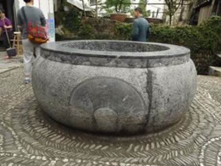 北斗七星井位于江西省上饒市婺源縣江灣鎮(zhèn)江灣景區(qū)內(nèi),北斗七星井體現(xiàn)了”天、地、人合一”的中國風(fēng)水學(xué)最高原則,南側(cè)梨園河呈太極圖“S”形系。北宋初年,南唐國師何令通遭貶來到江灣靈山隱居,與蕭江六世祖江文采交往甚篤,便指引蕭江氏族人由旃坑遷居風(fēng)水寶地云灣(現(xiàn)為江灣)。蕭江先祖在他的指引下,利用風(fēng)水學(xué)的最高原理,對江灣的水系環(huán)境、建筑布局、街衢走向,山脈走勢等方面進(jìn)行了改造。族人自遷云灣后人丁日益興旺、科第舉發(fā),其中村內(nèi)的北斗七星井便是國師運(yùn)用風(fēng)水學(xué)的典范。 中國古代的四個方位分別是“前朱雀后玄武、左青龍右白虎”,而江灣的地勢是玄武(后龍山)偏低,朱雀(對面攸山)偏高,朱雀屬火,也就是說南方火勢較旺,是一個較為不利的地形。當(dāng)時(shí)何令通便想出在村中挖七口井,并按北斗七星狀分布,以七井之水鎮(zhèn)住攸山火勢。而北斗七星分布又是呈勺子狀的,從此,村內(nèi)即有了充足水源又有了舀水的勺子,攸山之火自然就被鎮(zhèn)住了。