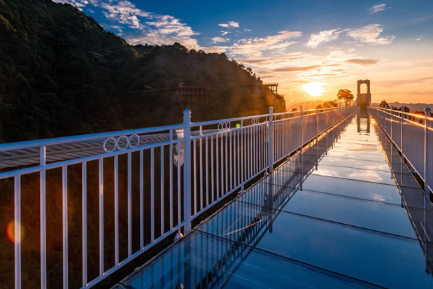 玻璃天橋,全長330米,寬2.5米,最高落差198米,是目前江西最長的玻璃天橋。山間云霧繚繞,橫跨兩山的玻璃橋仿佛橫架云端,恰似人間仙境。