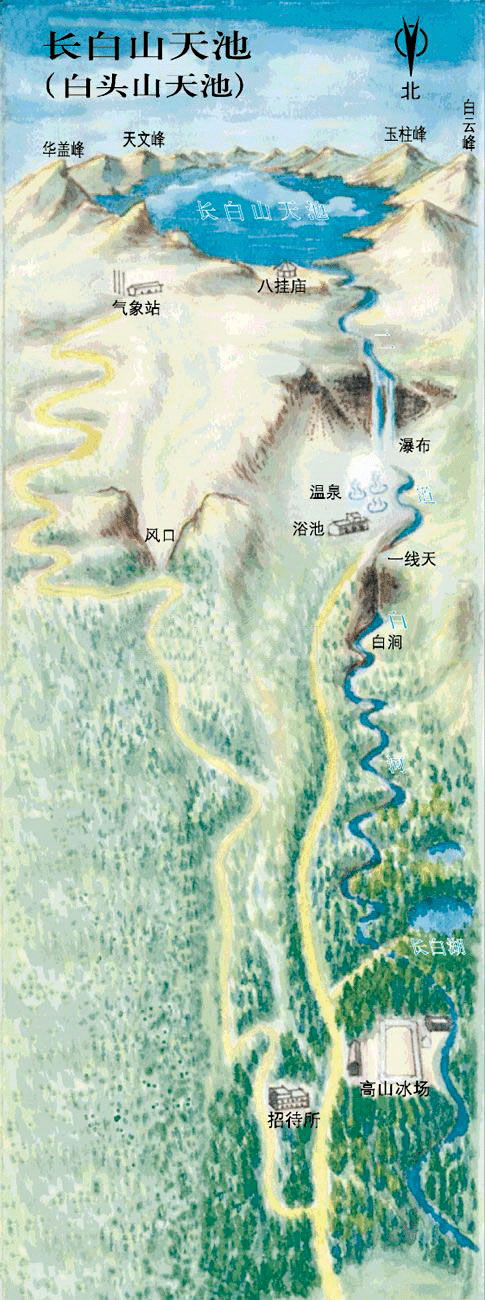 二道白河直接發(fā)源于長白山天池,是第西流松花江的正源,鴨綠江發(fā)源于長白山天池南麓,圖們江源于長白山天池東麓。 [10]天池北側(cè)有一缺口,古稱闥門,水北流稱乘槎河(又稱通天河)。該河夾流在天豁峰與龍門峰之間,全長1250米,在其盡頭形成高達68米的長白瀑布,瀑布下有長白溫泉,均與二道白河相通。