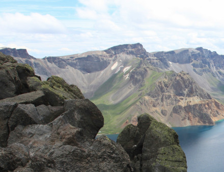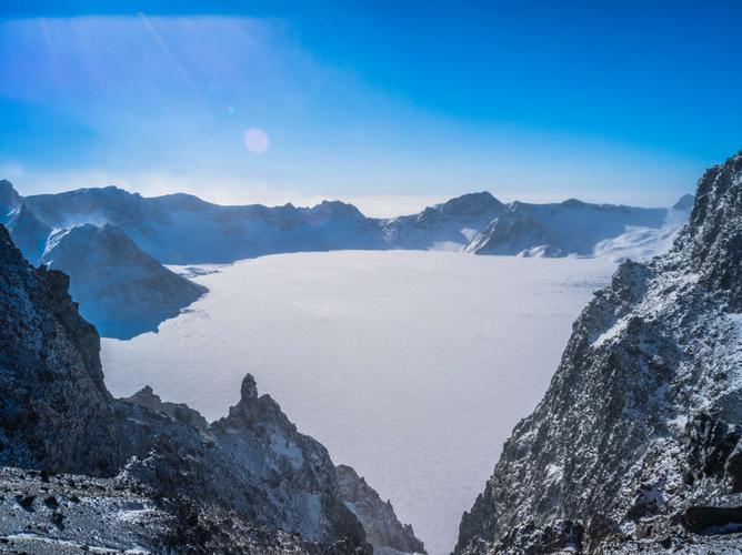 天池周圍火山口壁陡峭,并形成十幾座環(huán)狀山山峰,海拔均在2500米以上,其中將軍峰最高,海拔2749米,位于朝鮮一側(cè)。白云峰海拔2691米,在天池西側(cè),為中國東北的第一高峰。天池東北有天豁、鐵壁、華蓋、紫霞諸峰,天池西南有梯云、臥虎、冠冕(玉雪)諸峰,天池西北有龍門、觀日、錦屏、芝盤、玉柱(青石)諸峰。因駐有氣象站而得名的天文峰(2670米),介于鐵壁、華蓋兩峰之間,山峰不顯,有公路直抵山顛,可俯瞰天池。