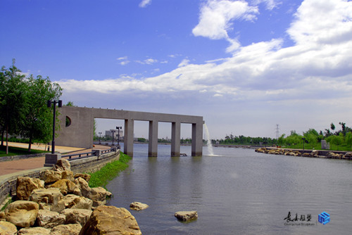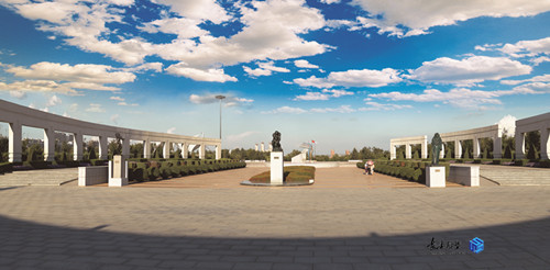 規(guī)劃采用中國傳統(tǒng)與西方造園學(xué)說和現(xiàn)代規(guī)劃理念相結(jié)合的構(gòu)思,達到了自然與人文的和諧統(tǒng)一,主入口大門及兩側(cè)弧形引導(dǎo)墻,沿中軸線對稱布局相得益彰;不對稱的景觀廣場,運用巧妙的軸線轉(zhuǎn)折,通過拱形橋與主題雕塑遙相呼應(yīng)。
