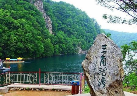 三角龍灣又名黑龍?zhí)叮瑐髡f有一條三只角的黑龍距此修煉,經(jīng)常行云布雨,除惡降魔,普濟(jì)四方百姓,后來黑龍飛往長白山天池,龍去留淵,留有一灣圣水。位于輝南城朝陽鎮(zhèn)東南45公里處的高山密林之中。系古代火山噴發(fā)口積水而成,因水面呈三角形,加之湖南側(cè)矗立著30米高的三角石,故名“三角龍灣”。是進(jìn)入長白山的門戶之一。這里自古以來風(fēng)光秀美,景色迷人。我國著名第二大火山群—龍崗火山群就分布在這里。