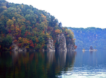 映霞壁是碼頭邊的陡峭石壁,高90余米,面向正東,每天朝陽初升的時候,萬丈霞光與水氣發(fā)生了光學(xué)折射,遠(yuǎn)遠(yuǎn)望過來,佛光普照,宛如迷離仙境一般。