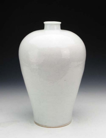 明永樂白釉暗串枝蓮花梅瓶:小口,圓唇,短頸,豐肩。器物紋飾為劃花,器物肩部上下各兩道弦紋,中間為靈芝纏枝花紋,八顆靈芝首尾相接,纏枝不斷。腹部兩組大荷葉蓮花,每組為三朵蓮花并蒂爭相開放,神態(tài)各異。此瓶為明永樂時期景德鎮(zhèn)官窯器,甜白釉,白中閃青。釉色白瑩,光亮潤澤,胎質(zhì)細潔,整個器物造型規(guī)矩。肩部圓潤略顯豐滿。底足為平底。