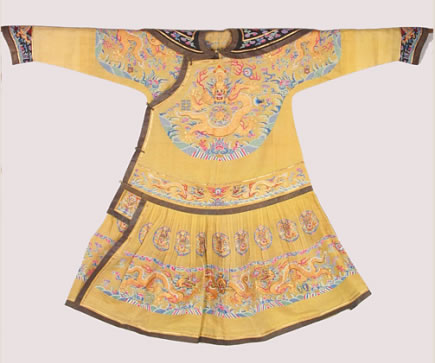 清明黃納紗五彩金龍夏朝服:清代光緒皇帝載湉御用。此朝服是夏季禮服之一,為其登基、大婚、萬壽圣節(jié)、祭天等重大典禮和祭祀活動時所穿禮服。為明黃顏色,是一種披肩領、馬蹄袖的大襟袍。披肩為黑紗地納紗繡平金龍二條,上衣兩肩和前胸、后背飾正龍各一條,飾有傳統(tǒng)紋樣十二章,間以五色云紋,下幅為平水紋飾。