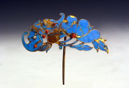清點翠頭簪:用珊瑚、珍珠制成。整個主題為蝶戀花,蝴蝶在花下,一花開放,旁有兩朵含苞欲放的花,蝴蝶和花均為藍色,應為翠鳥毛制成,花瓣為兩層,均為五瓣,花蕊用珊瑚制成,兩花苞微微下耷,蝴蝶的翅膀為展開狀,蝴蝶的眼睛及翅膀上均有珊瑚珠。