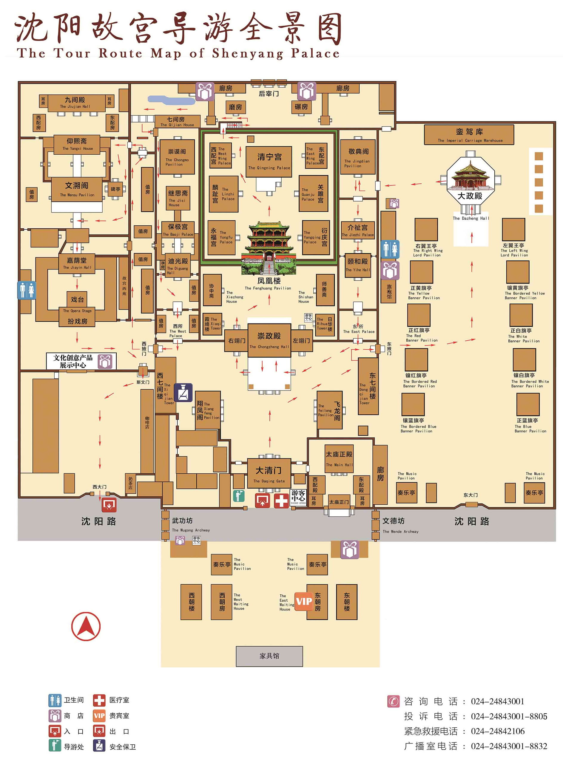 中路為整個建筑群的中心,分前后3個院落。南端為照壁、東西朝房、奏樂亭;前院有大清門、崇政殿、飛龍閣、翔鳳閣;中院有師善齋、協(xié)中齋、鳳凰樓;后院是以清寧宮為主的五宮建筑。中院和后院兩側(cè)各有一跨院,稱東宮、西宮。東宮有頤和殿、介祉宮、敬典閣;西宮有迪光殿、保極宮、繼思齋、崇謨閣。大清門是沈陽故宮的正門,是文武群臣候朝之處,為五間硬山式建筑,正脊、垂脊及兩山的“墀頭”均以五彩琉璃鑲造。崇政殿是故宮的正殿,建于后金天聰時,是清初朝會之所,為五間九檁硬山式,俱辟隔扇門,前后有出廊,圍以石雕欄桿。頂蓋黃琉璃瓦鑲綠剪邊,殿內(nèi)徹上明造,梁架全部為和璽彩繪。殿前東置日晷,西設嘉量。殿后是鳳凰樓,同清寧宮、關睢宮、衍慶宮、永福宮、麟趾宮五宮建在近4米的高臺之上,四周繞以高墻,獨成一座宮院。