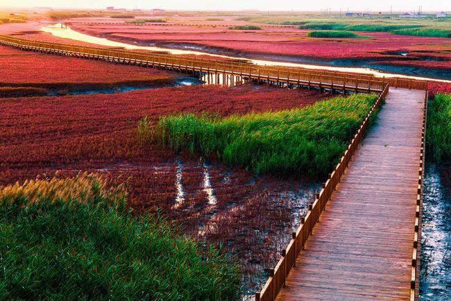 紅海灘國(guó)家風(fēng)景廊道它位于遼寧省盤錦紅海灘濕地旅游度假區(qū),南起二界溝混江溝大橋,北至紅海灘濕地旅游度假區(qū)接官?gòu)d大橋與旅游路接口,全長(zhǎng)18.115公里。是獨(dú)一無(wú)二的“世界紅色海岸線”,也被稱為“中國(guó)最精彩的休閑廊道”和“中國(guó)最浪漫的游憩海岸線”。中國(guó)婚協(xié)授予了紅海灘國(guó)家風(fēng)景廊道“中國(guó)婚禮文化產(chǎn)業(yè)基地”榮譽(yù)。