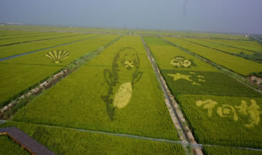稻田作畫,又稱稻田彩繪,主要是以黃色、綠色和紫色葉水稻種植于水田中,栽種時(shí)先在農(nóng)田里用傳統(tǒng)畫線器,畫出九宮格,依圖樣定出坐標(biāo),再牽線繪出圖樣或字體輪廓,最后種上黃色秧苗,隨著水稻生長(zhǎng),就會(huì)呈現(xiàn)出預(yù)先規(guī)劃的圖形或文字。在不同的位置栽種不同的稻米品種,通過(guò)精細(xì)巧妙的排列組合,不同顏色葉子的稻米會(huì)在生長(zhǎng)過(guò)程中自然鋪陳出一幅幅美麗的圖畫。稻田彩繪可以維持兩個(gè)半月左右。