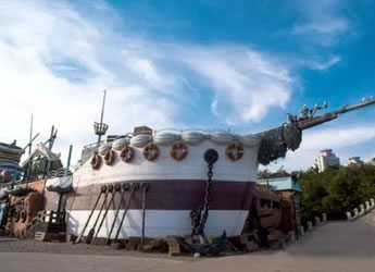 海盜村以海盜和海盜景物的卡通造型,對(duì)所有建筑,游樂(lè)設(shè)施、休閑場(chǎng)所,景觀進(jìn)行包裝。一期工程中的海盜船,是國(guó)內(nèi)僅有的架設(shè)在海灣海平面上的海盜船。它的支點(diǎn)高13.5米,最大擺角120度,每船可以乘游客40人。