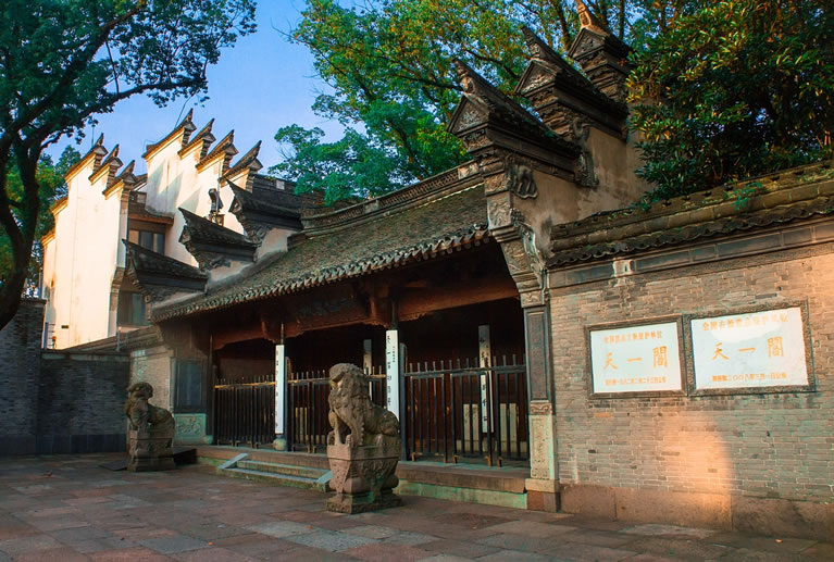 天一閣,位于浙江省寧波市海曙區(qū),建于明嘉靖四十年至四十五年(1561年—1566年),由當(dāng)時退隱的明朝兵部右侍郎范欽主持建造,占地面積2.6萬平方米,已有400多年的歷史。天一閣藏書樓坐北朝南,為兩層磚木結(jié)構(gòu)的硬山頂重樓式建筑,通高8.5米,斜坡屋頂,青瓦覆上。一層面闊、進(jìn)深各六間,二層除樓梯間外為一大通間,以書櫥間隔。閣前鑿“天一池”通月湖,園林以“福、祿、壽”作總體造型,用山石堆成“九獅一象”等景點。天一閣及其周圍園林具有江南庭院式園林特色。天一閣的藏書和建筑為研究書法、地方史、石刻、石構(gòu)建筑和浙東民居建筑提供了實物資料。