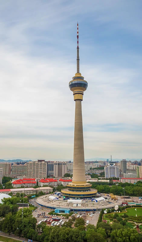 中央電視塔,位于中國北京市海淀區(qū),占地面積15.4公頃,塔高405米,始建于1987年1月,于1994年10月對外開放,是集廣播電視發(fā)射和旅游觀光、餐飲、娛樂為一體的綜合性建筑。中央電視塔由棧橋廣場、退臺(tái)環(huán)廊、塔基、塔座、塔身、塔樓和桅桿組成。塔的造型別致,祈年殿式的重檐形式塔座;從地面升高到223米處,筒徑半徑向外挑出10米,形成一宮燈形的塔樓。采取混凝土整體澆注法,能達(dá)到抵抗九級(jí)地震的建筑要求。