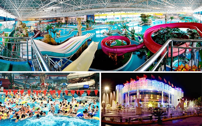 石家莊天山海世界是國(guó)內(nèi)較大的室內(nèi)恒溫水上戲水項(xiàng)目,是按國(guó)家AAAAA級(jí)標(biāo)準(zhǔn)全力打造的全民健身樂(lè)園,坐落在河北省石家莊高新技術(shù)開(kāi)發(fā)區(qū)。建筑面積約5萬(wàn)平方米,總投資達(dá)10億人民幣,室內(nèi)凈高30多米。占地130余畝。該項(xiàng)目以“水”為主體,處處體現(xiàn)了水的存在。萬(wàn)余平方米的戲水大廳,分兒童戲水區(qū)、成人戲 水區(qū)、按摩區(qū)、造浪區(qū)及漂流河。為了滿(mǎn)足冬泳的需要,戲水大廳設(shè)置了恒溫設(shè)備,保持了室溫30℃,水溫28℃;為了解決水質(zhì)問(wèn)題采用了24小時(shí)不間斷循環(huán)水消毒,使水的純凈度達(dá)到國(guó)際標(biāo)準(zhǔn);另外特設(shè)了一次能容納200余人的快餐廳,以及桑拿、保健、按摩等設(shè)備設(shè)施。