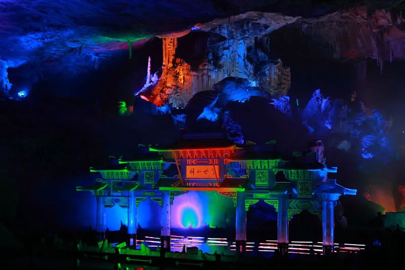 - 特色:洞內(nèi)分為七個(gè)洞廳,前四廳為自然景觀,展示石筍、石幔、石花等形態(tài)各異的鐘乳石;后三廳為人工打造的“神仙世界”游樂宮,結(jié)合聲、光、電技術(shù),展現(xiàn)奇幻的溶洞世界。