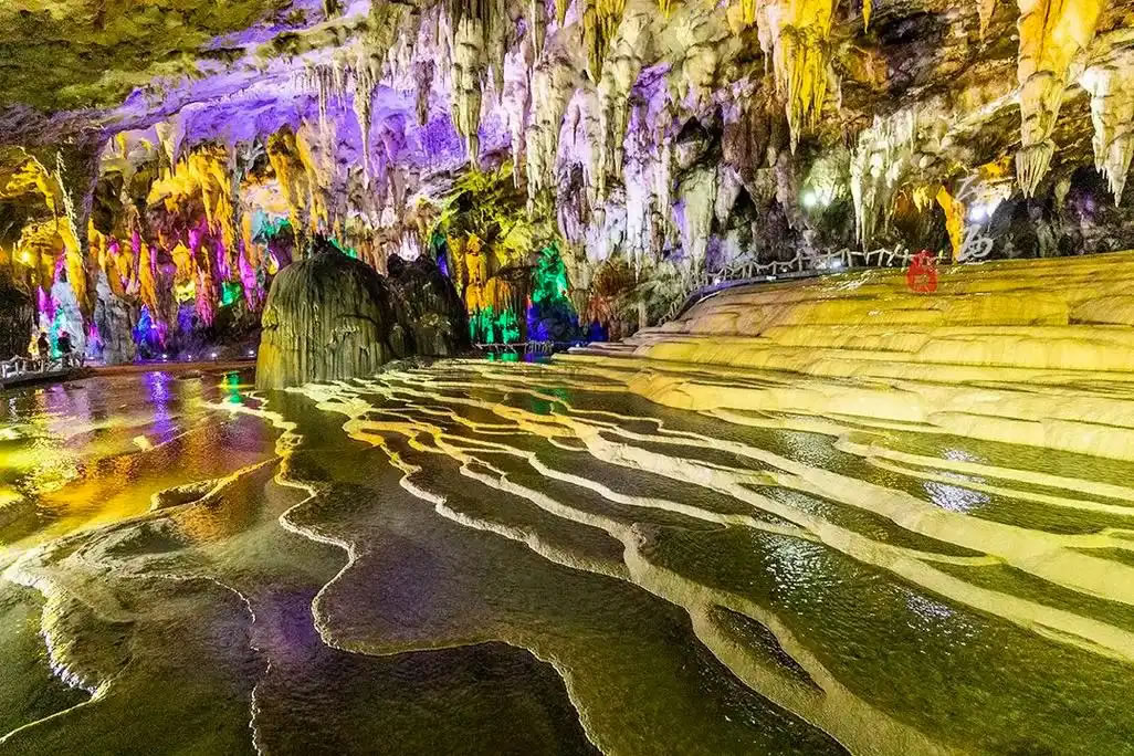 - 核心特色:洞內(nèi)分四層結(jié)構(gòu),已開放第二層約2公里游覽線,包含五大主題廳——吉星迎賓、壯鄉(xiāng)聽海、云山鑒水、詩畫田園、幽靜奇觀。景觀涵蓋鈣華池梯田、神象賜福、天下第一鐘等1000余處天然獨立景觀,其中鈣華池群面積達(dá)6000平方米,黑白對比形成獨特視覺奇觀。