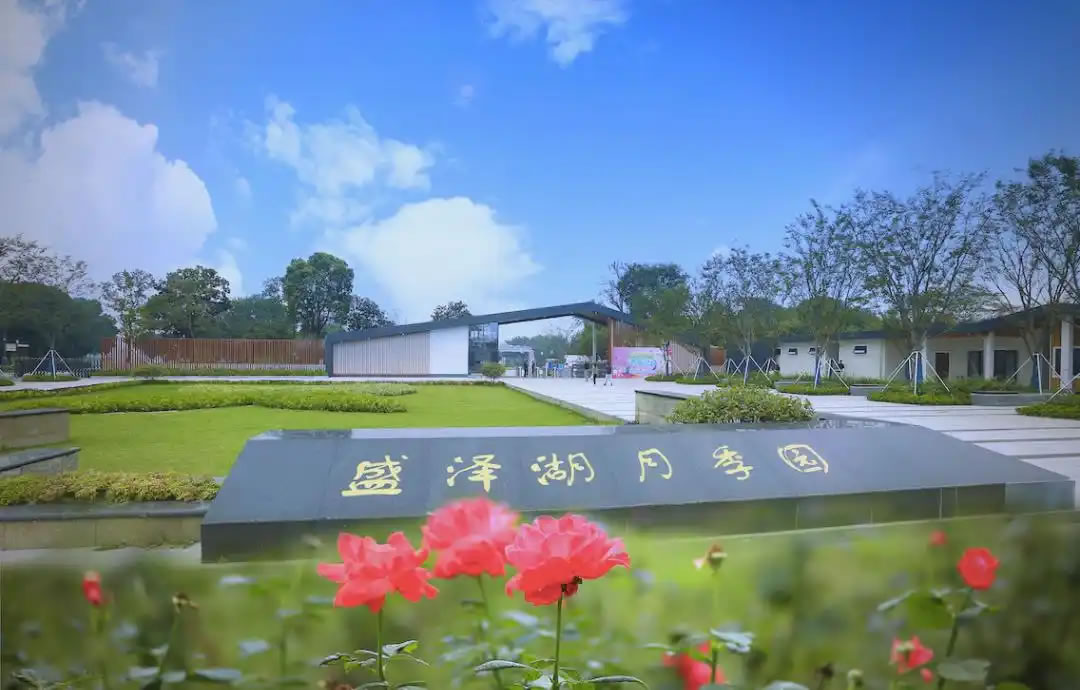 盛澤湖月季園位于江蘇省蘇州市相城區(qū)盛澤湖畔,與陽澄湖水域相溝通,湖面資源達(dá)5平方公里,占地面積800畝,為國(guó)家AAA級(jí)旅游景區(qū)。園區(qū)以月季為主題,種植月季近千余種約100萬余株,輔以200余種喬灌木共計(jì)11萬余棵,形成園湖一體的生態(tài)休閑花園,水質(zhì)達(dá)到地表水II類標(biāo)準(zhǔn)。景區(qū)劃分為入口服務(wù)區(qū)、月季觀賞區(qū)、生態(tài)科普區(qū)、商業(yè)休閑區(qū)和運(yùn)動(dòng)康體區(qū)五大功能區(qū),配有盆景園、木棧道、研學(xué)基地及拓展運(yùn)動(dòng)場(chǎng)等設(shè)施。園內(nèi)月季河沿岸繁花夾道,設(shè)有紫藤花架、組合滑梯等景觀與兒童設(shè)施,并舉辦無人機(jī)光影表演等特色活動(dòng)。其體育休閑旅游場(chǎng)景入選2023年江蘇省體育消費(fèi)場(chǎng)景典型案例。入口服務(wù)區(qū)設(shè)有可容納千人的大草坪,供親子活動(dòng)使用。