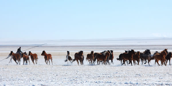 冬季那達(dá)慕 每年十二月,在巴彥呼碩敖包山上舉行,是冬季草原牧區(qū)生活的集中展示。雪地賽馬,賽駱駝,馬拉雪橇、雪地博克盡顯北方少數(shù)民族的豪氣和強(qiáng)悍,也是冬季風(fēng)情和服飾的大展臺,是草原人們挑戰(zhàn)寒冷、超越自我的盛會。