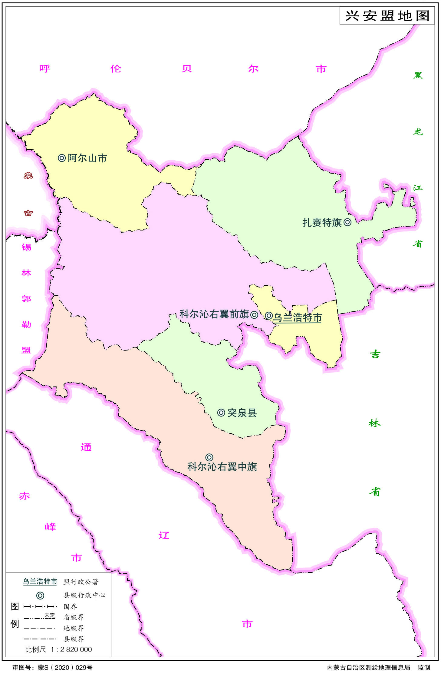 興安盟位于內(nèi)蒙古東北部,大興安嶺向松嫩平原過渡帶,東北、東南分別與黑龍江、吉林兩省毗鄰;南部、西部、北部分別與通遼、錫林郭勒和呼倫貝爾相連;西北部與蒙古接壤,邊境線長126千米。盟境南北長380千米,東西寬320千米,總面積5.51萬平方千米。
