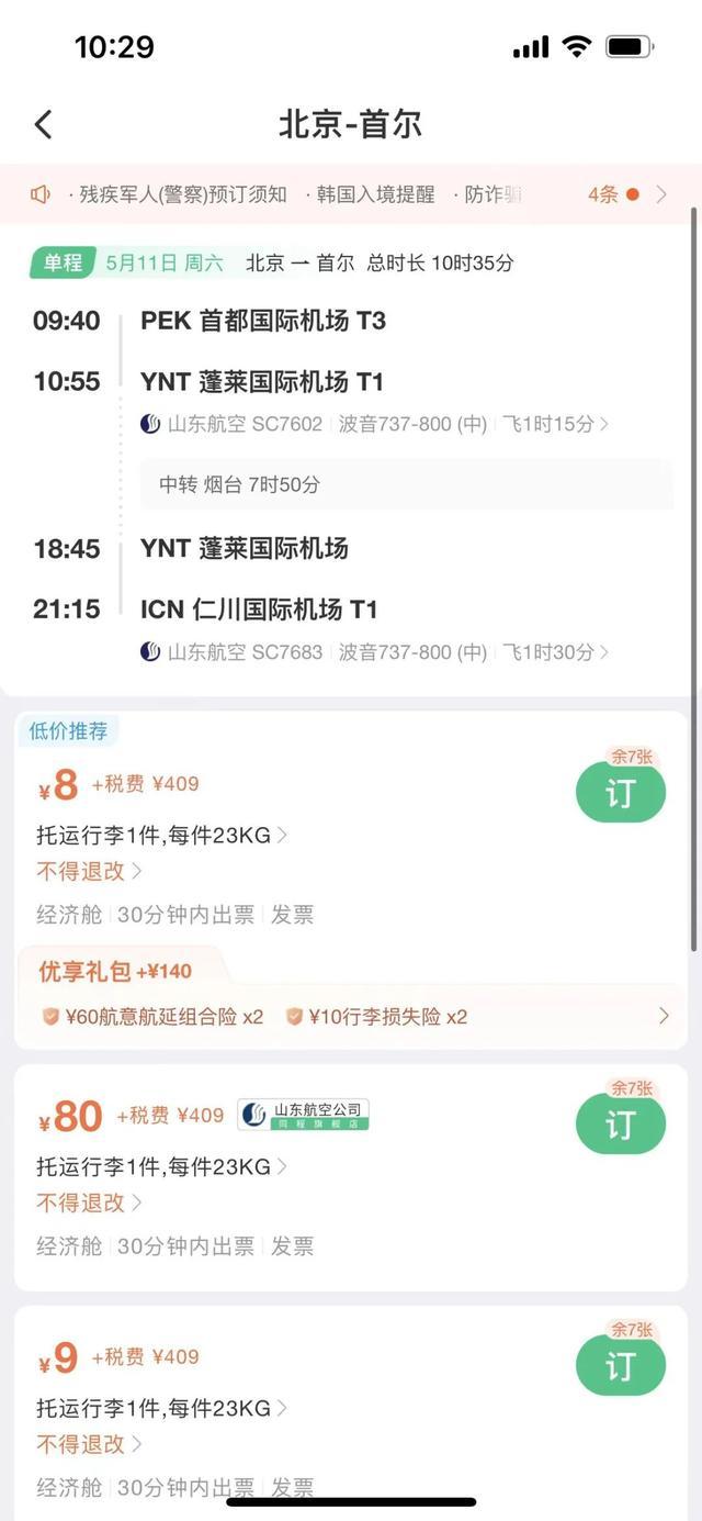 國際機(jī)票方面,中新經(jīng)緯查詢發(fā)現(xiàn),5月11日北京飛往首爾的機(jī)票(不含稅)價格低至8元,但另需409元稅費(fèi)。具體來看,該航班5月11日早9點(diǎn)40分從北京首都機(jī)場起飛,經(jīng)煙臺蓬萊國際機(jī)場轉(zhuǎn)機(jī),于當(dāng)天晚上9點(diǎn)15分落地仁川國際機(jī)場。