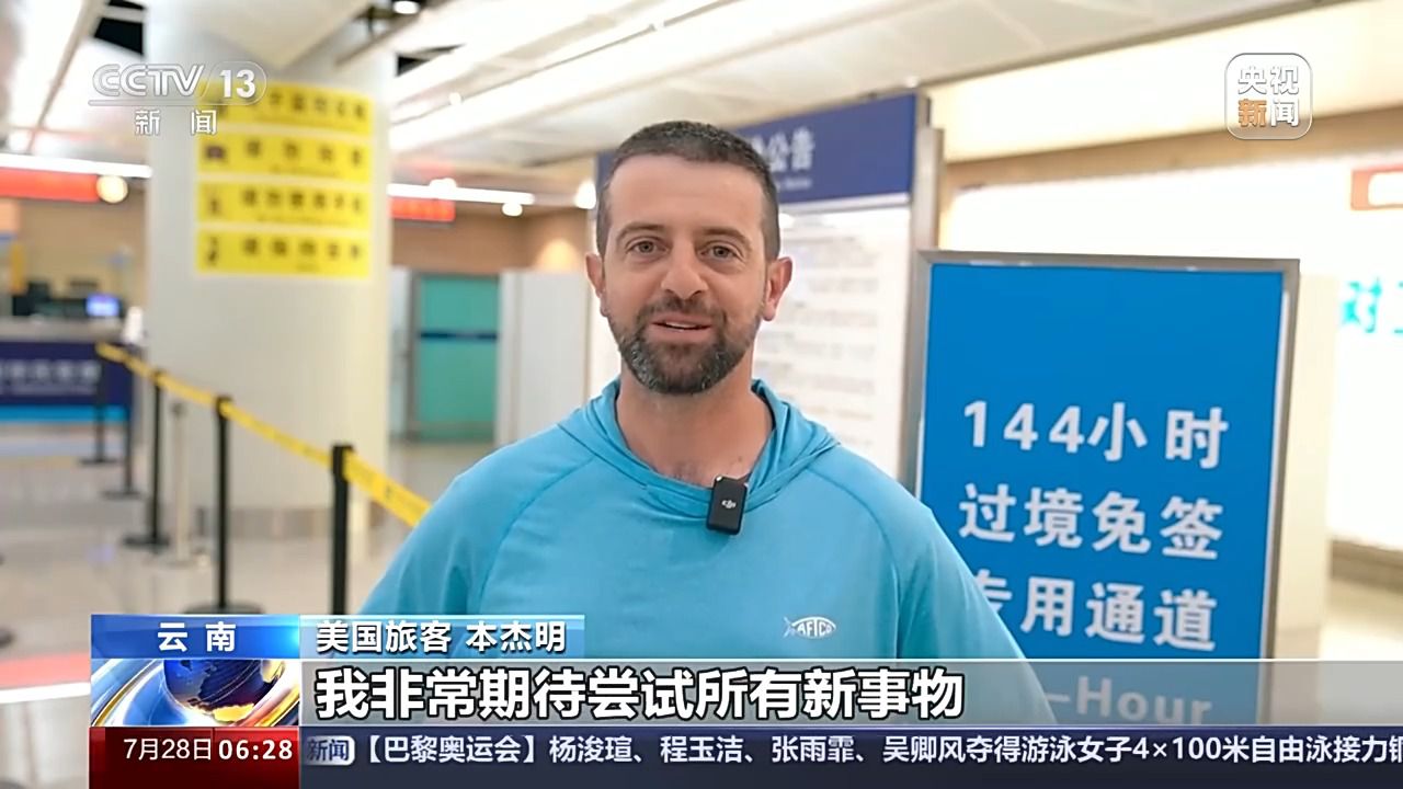 7月16日,在昆明國(guó)際機(jī)場(chǎng),美國(guó)旅客本杰明,成為云南省144小時(shí)過(guò)境免簽政策停留范圍擴(kuò)大后首位享受政策便利的旅客。