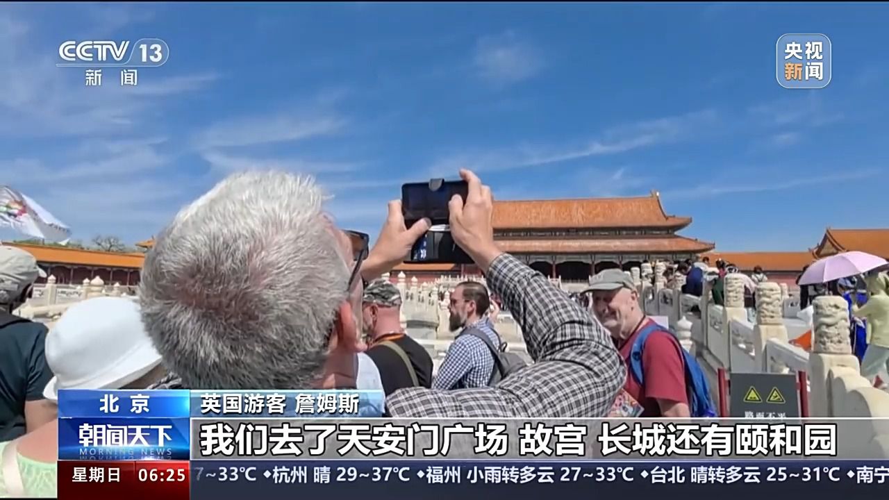 英國(guó)游客 詹姆斯:在北京的旅途特別好,我喜歡這里的一切,人、文化和食物等等一切事物。我們?nèi)チ颂彀查T(mén)廣場(chǎng)、故宮、長(zhǎng)城,還有頤和園。