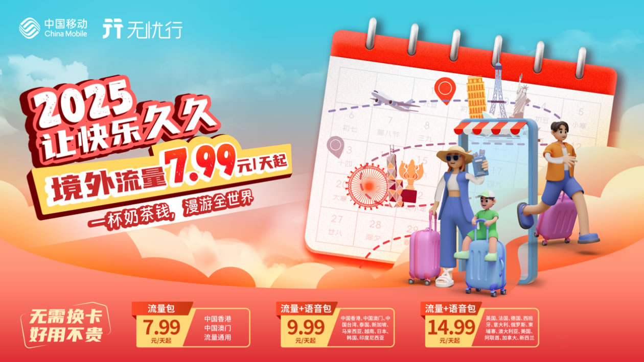 在這左右為難之際,小伙伴們,何不換一種視角,去探索一個更優(yōu)的選擇?無需換卡換號,也無需占用行李空間,國內(nèi)運營商的國際漫游流量包,為你打造暢游網(wǎng)絡(luò)世界的通行證。還有超值福利等你來享,助你沉浸式體驗旅行本身的樂趣。以中國移動為例,目前,中國移動國際/港澳臺漫游已覆蓋全球200多個國家/地區(qū),提供多種流量套餐,包天不限量/限量不限速多種方式供你選擇,線上渠道輕松購買,不用換卡換號,落地即可激活,讓你隨時隨地享受高速穩(wěn)定的網(wǎng)絡(luò)體驗和服務(wù),旅途的每一刻都松弛感滿滿!