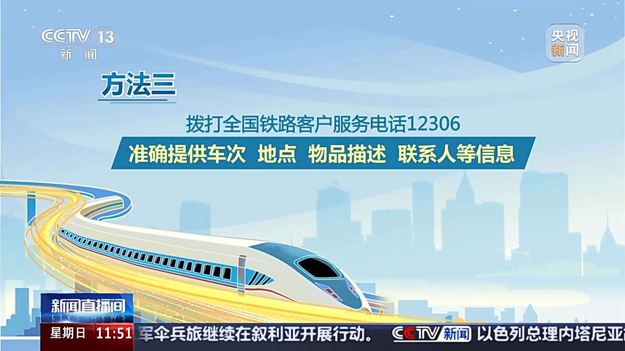 方法三:撥打全國(guó)鐵路客戶服務(wù)電話12306,準(zhǔn)確提供車(chē)次、地點(diǎn)、物品描述、聯(lián)系人等信息,鐵路部門(mén)將全力幫您查找。