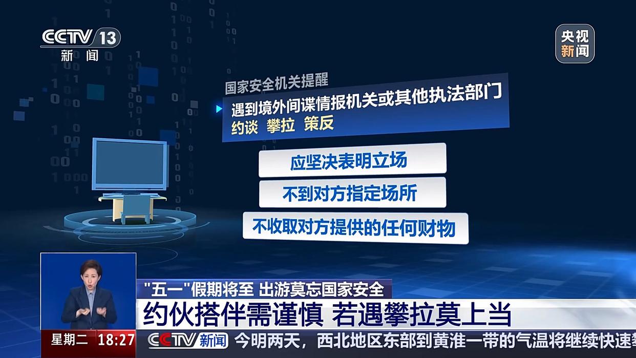 遇到境外間諜情報(bào)機(jī)關(guān)或其他執(zhí)法部門約談、攀拉、策反,應(yīng)堅(jiān)決表明立場,不到對方指定場所,不收取對方提供的任何財(cái)物,不簽署任何文件,不透露任何內(nèi)部信息,堅(jiān)持要求聯(lián)系我國駐外使領(lǐng)館尋求領(lǐng)事保護(hù)。