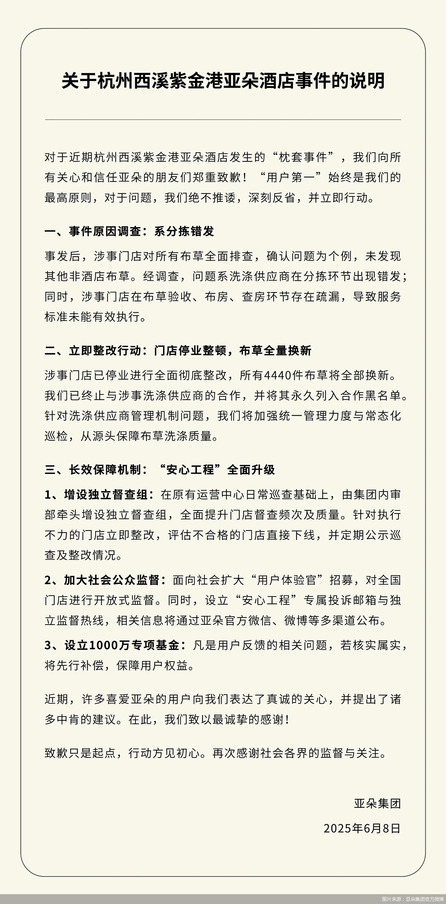 6月8日,據(jù)“亞朵集團(tuán)”官方微博消息,亞朵集團(tuán)發(fā)布關(guān)于杭州西溪紫金港亞朵酒店事件的說(shuō)明,對(duì)于近期杭州西溪紫金港亞朵酒店發(fā)生的“枕套事件”,亞朵集團(tuán)向所有關(guān)心和信任亞朵的朋友們鄭重致歉。事發(fā)后,涉事門(mén)店對(duì)所有布草全面排查,確認(rèn)問(wèn)題為個(gè)例,未發(fā)現(xiàn)其他非酒店布草。經(jīng)調(diào)查,問(wèn)題系洗滌供應(yīng)商在分揀環(huán)節(jié)出現(xiàn)錯(cuò)發(fā);同時(shí),涉事門(mén)店在布草驗(yàn)收、布房、查房環(huán)節(jié)存在疏漏,導(dǎo)致服務(wù)標(biāo)準(zhǔn)未能有效執(zhí)行。