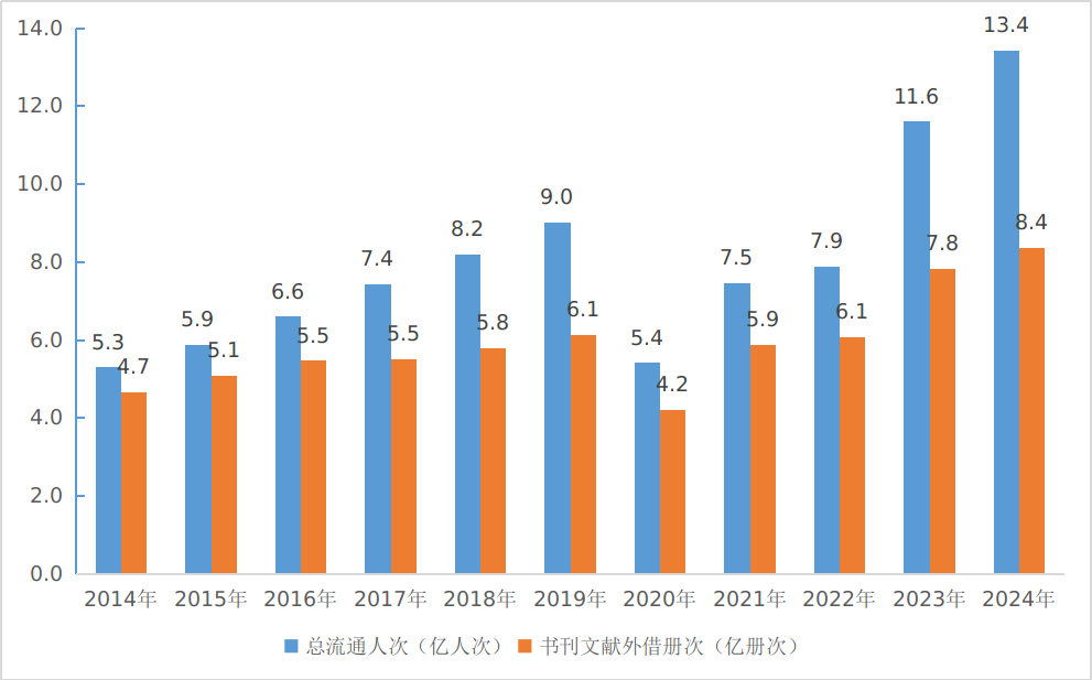 圖2:2014—2024年全國公共圖書館總流通人次及書刊外借冊(cè)次