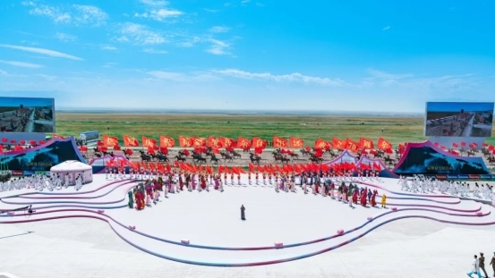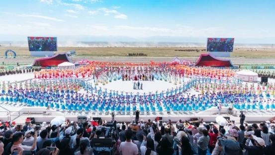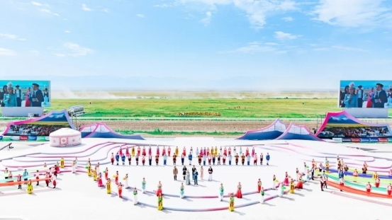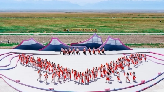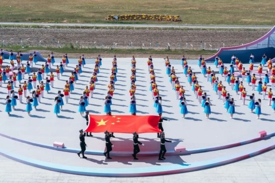 開幕式尾聲中,全體演員深情合唱《歌唱祖國(guó)》。同時(shí),氣勢(shì)恢宏的“萬(wàn)馬奔騰”表演在喀爾坎特草原激情上演,將整場(chǎng)演出再度推向高潮。
