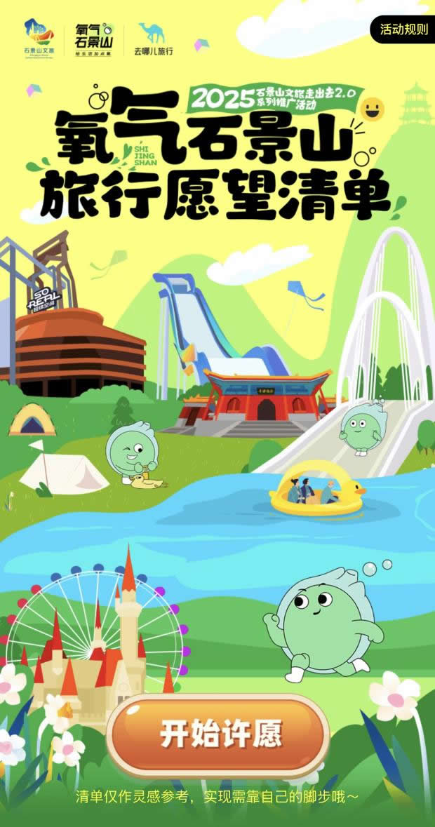 在“去哪兒”旅行APP上線“氧氣石景山”文旅專題頁(yè),不僅整合酒店榜單、景區(qū)門票、優(yōu)質(zhì)攻略等核心文旅資源,更特別設(shè)置石景山區(qū)對(duì)口支援和協(xié)作地文旅產(chǎn)品版塊,實(shí)現(xiàn)“石景山推廣+支援地區(qū)助銷”雙重價(jià)值。同步推出的“旅行打卡愿望清單”H5,線上用戶可點(diǎn)亮自己的石景山旅游心愿,生成專屬旅行愿望清單;在高校路演活動(dòng)中,大學(xué)生可分享H5到社交媒體作為參與活動(dòng)的入場(chǎng)券——既為高校活動(dòng)預(yù)熱,更成為高校路演入場(chǎng)憑證,串聯(lián)起“線上互動(dòng)-線下參與”的閉環(huán)。