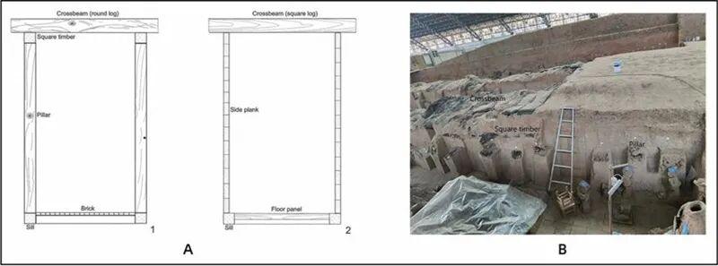 陪葬坑過(guò)洞主要木質(zhì)框架結(jié)構(gòu)示意圖(A1:兵馬俑坑;A2:K9901及K9801)及兵馬俑一號(hào)坑內(nèi)炭化木質(zhì)建筑結(jié)構(gòu)。秦始皇帝陵博物院供圖