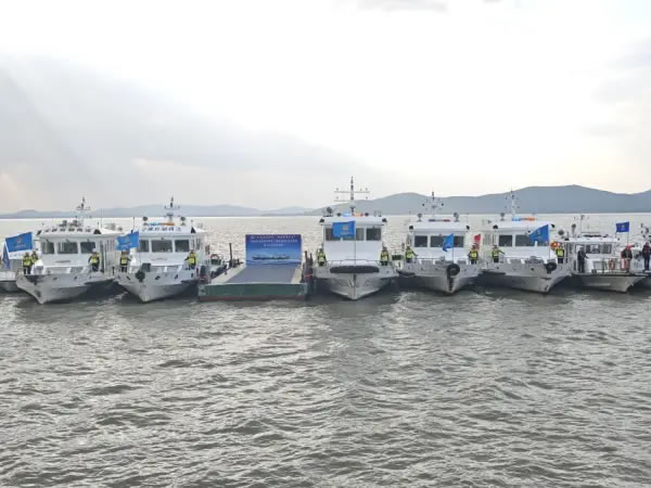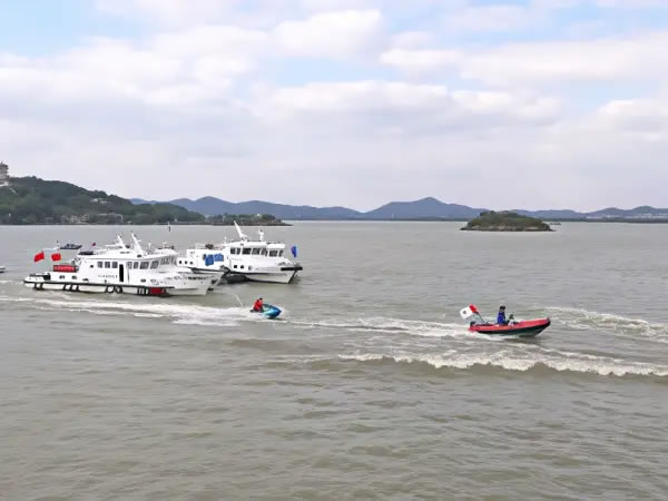 本次演練以“實(shí)戰(zhàn)導(dǎo)向、效果為先”為原則,模擬船舶碰撞、人員落水等極端場(chǎng)景,共分為旅游船舶開航前自查、旅游船舶環(huán)太湖聯(lián)動(dòng)動(dòng)態(tài)監(jiān)測(cè)、極端天氣旅游船舶應(yīng)對(duì)處置、旅游船舶險(xiǎn)情處置、人員落水應(yīng)急處置5個(gè)科目。其中,旅游船舶開航前自查科目中,對(duì)照《中國(guó)籍船舶開航前自查清單》嚴(yán)格開展自查工作,確保船舶適航、人員適配,保證航行安全。環(huán)太湖旅游船舶聯(lián)動(dòng)動(dòng)態(tài)監(jiān)測(cè)科目驗(yàn)證了現(xiàn)有監(jiān)控系統(tǒng)對(duì)湖區(qū)船舶的精準(zhǔn)感知與實(shí)時(shí)管控能力,檢驗(yàn)了跨區(qū)域多部門協(xié)同響應(yīng)機(jī)制的可行性與高效性。極端天氣旅游船舶應(yīng)對(duì)處置科目模擬旅游船舶航行途中遭遇極端天氣,“蘇交執(zhí)法錫039”輪、“湖州執(zhí)法艇浙交巡0328”輪迅速進(jìn)入伴航狀態(tài),與游船配合形成“兩艇護(hù)一船”的防護(hù)陣形,全程護(hù)航,實(shí)時(shí)監(jiān)測(cè)周邊水域動(dòng)態(tài)、規(guī)避潛在風(fēng)險(xiǎn),主動(dòng)提供必要的航行協(xié)助。旅游船舶險(xiǎn)情處置科目充分展示旅游船舶在航行過(guò)程中突發(fā)極端天氣的全過(guò)程應(yīng)對(duì)處置,包括預(yù)警接收、封航、應(yīng)急避險(xiǎn)、協(xié)同數(shù)援、人員轉(zhuǎn)運(yùn)。人員落水應(yīng)急處置科目中,應(yīng)用無(wú)人機(jī)、遙控救生機(jī)器人新型智能裝備與數(shù)字化技術(shù),為最大限度挽救生命提供堅(jiān)實(shí)保障。