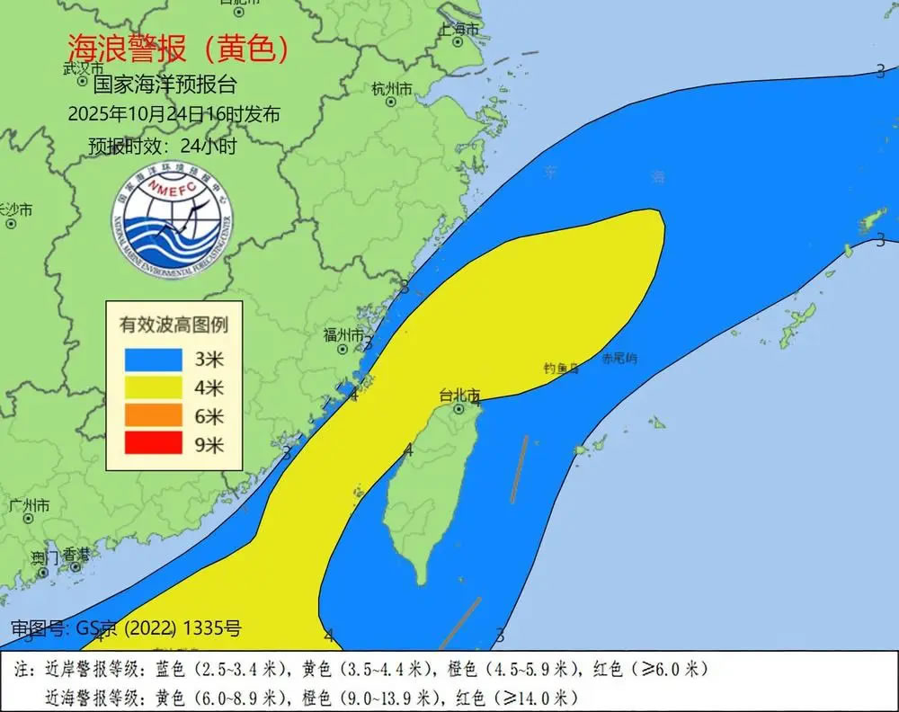 受強冷空氣的影響,預計10月24日下午到25日下午,東海南部、臺灣海峽將出現(xiàn)3米到5米的大浪到巨浪;福建近岸海域將出現(xiàn)2.5米到3.8米的大浪,該近岸海域海浪預警級別為黃色,浙江南部近岸海域將出現(xiàn)2米到3米的中浪到大浪,該近岸海域海浪預警級別為藍色。