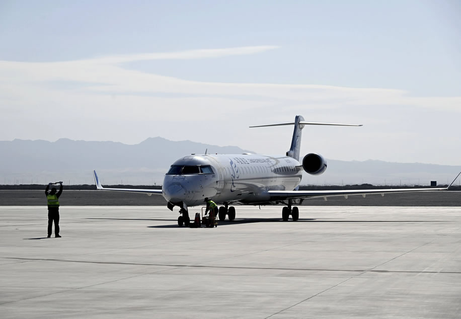 10月26日,敦煌至哈密冬春航季首航航班降落在敦煌莫高國(guó)際機(jī)場(chǎng)。 新華社發(fā)(張曉亮攝)