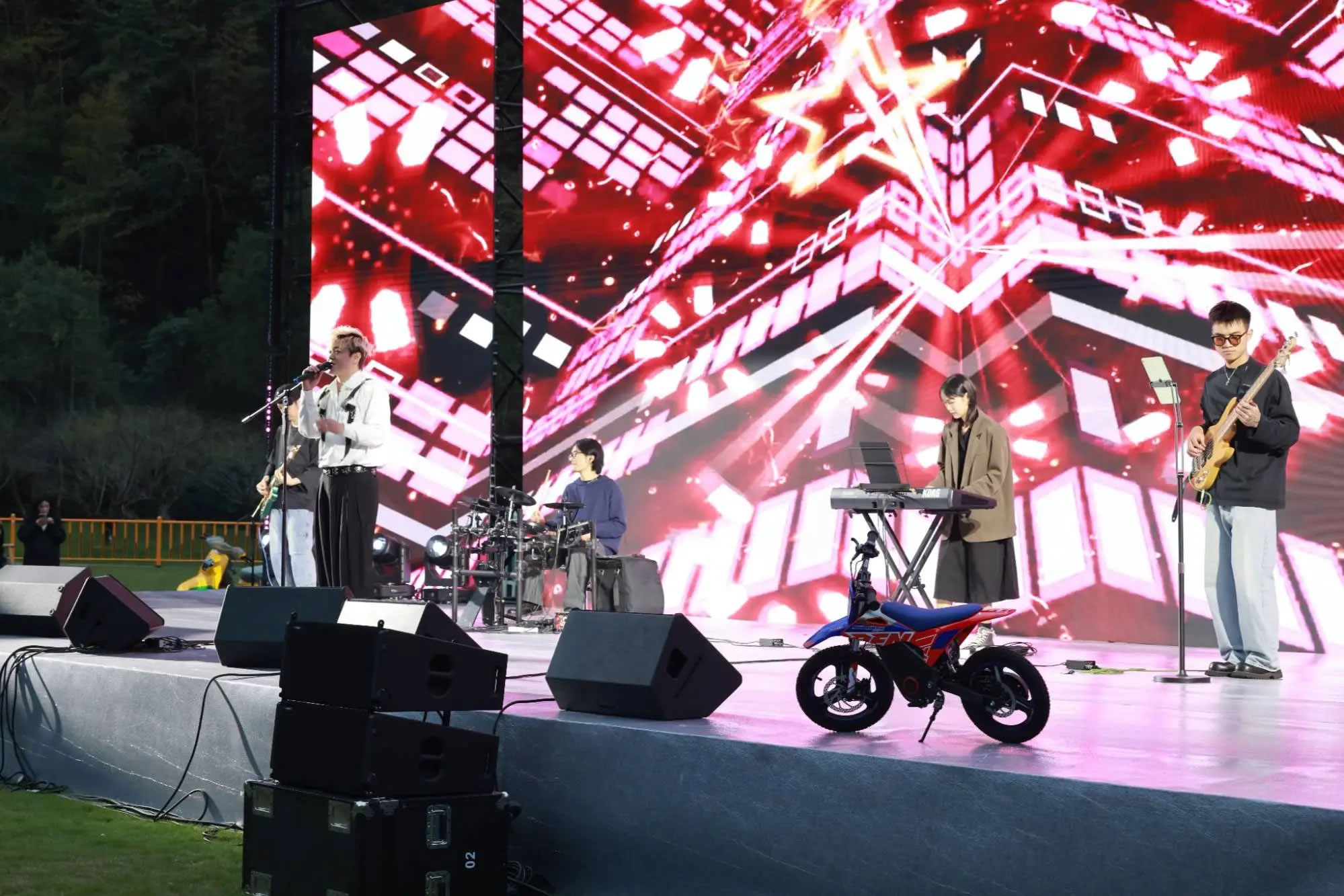 隨著機(jī)車隊(duì)伍陸續(xù)抵達(dá),十九峰大草坪迅速化身為音樂狂歡的海洋。從午后到夜晚,舞臺(tái)持續(xù)高能輸出。搖滾樂隊(duì)點(diǎn)燃全場(chǎng)熱情,流行金曲引發(fā)集體合唱。