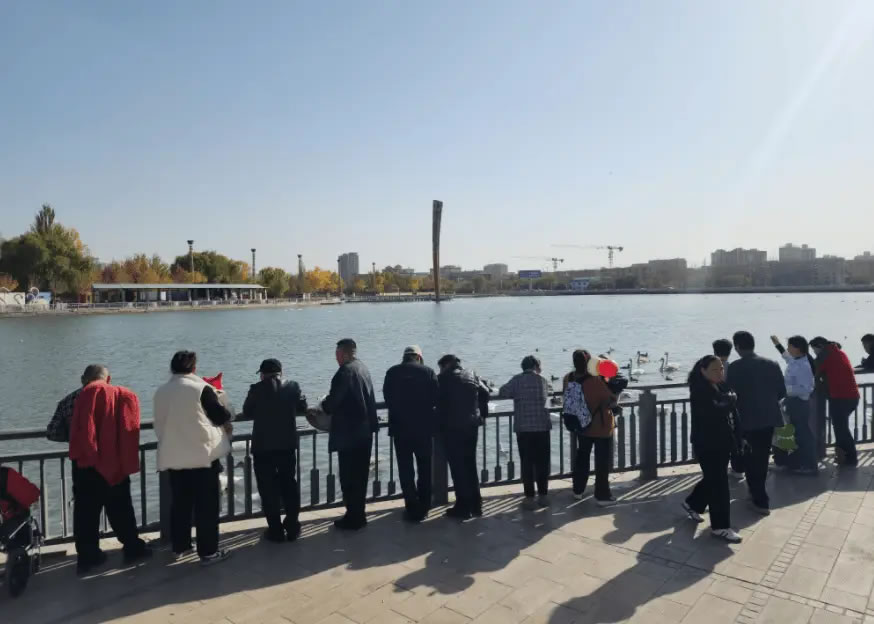 10月28日,在杜鵑河彭加木雕像水域附近,成群的天鵝和野鴨等鳥(niǎo)類(lèi)在河面上游弋、嬉戲,潔白的天鵝與碧水、藍(lán)天、樓宇相映成趣,美輪美奐,吸引了不少市民和游客駐足欣賞,構(gòu)成一幅自然和諧的生動(dòng)畫(huà)卷。重慶游客張清揚(yáng)說(shuō):“第一次來(lái)到庫(kù)爾勒,看到美麗的天鵝,心情都被治愈了,這是大自然的饋贈(zèng),庫(kù)爾勒的自然環(huán)境好,才會(huì)吸引這么多天鵝來(lái)這里過(guò)冬。”