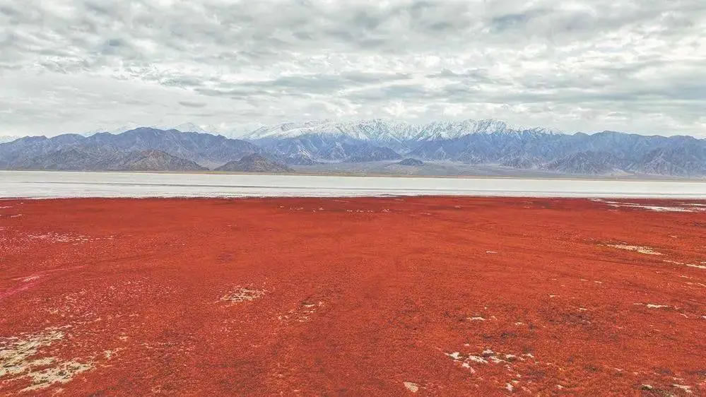 入秋后,海西蒙古族藏族自治州烏蘭縣的都蘭湖國家濕地公園,連片的鹽生植物鹽爪爪迎來最佳觀賞期。從高空俯瞰,宛如巨大的紅地毯鋪在都蘭湖畔,美不勝收,甚為壯觀。