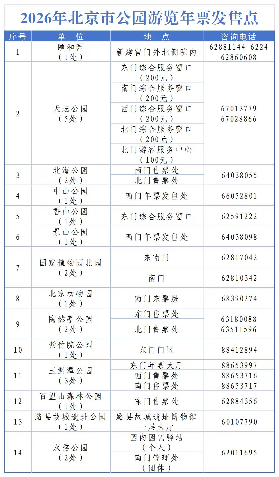 北京市公園游覽年票(100元)適用頤和園、天壇公園、北海公園、中山公園、香山公園、景山公園、國家植物園北園、北京動物園、陶然亭公園、玉淵潭公園、百望山森林公園、雙秀公園、北京國際雕塑公園、大觀園、地壇公園、水立方。使用時限為2026年1月1日到2027年1月31日。