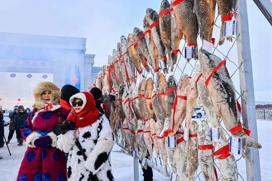 活動融合冰釣體驗、民俗展演與文化展示等,為游客打造了一場集運動、美食、互動于一體的沉浸式冰雪文旅盛宴。作為核心項目,中俄界河冰釣與冰捕區(qū)備受矚目。界河之上,五顏六色的暖帳錯落排布,冰釣愛好者早已按捺不住垂釣熱情,在帳篷內生起暖爐、鑿開冰面、下好魚餌,支起小板凳,靜觀浮漂等候“佳音”。